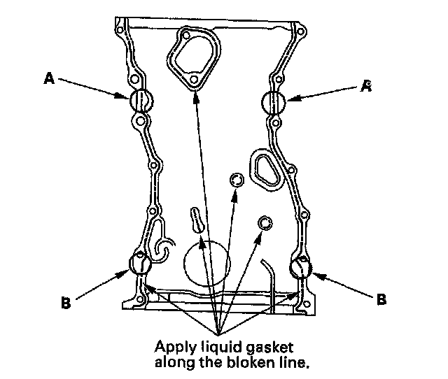 13. Apply liquid gasket to the engine block upper surface contact areas (A) on the chain case and lower block upper surface contact areas (B) on the chain case.