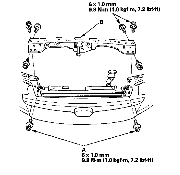 12. Remove the condenser bracket mounting bolts (A), then remove the bulkhead (B).