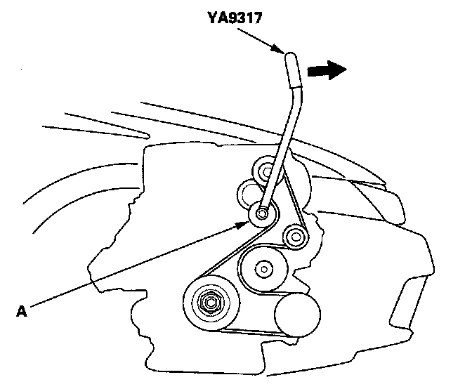 1. Move the auto-tensioner (A) using the belt tension release tool to relieve tension from the drive belt, then remove the drive belt.