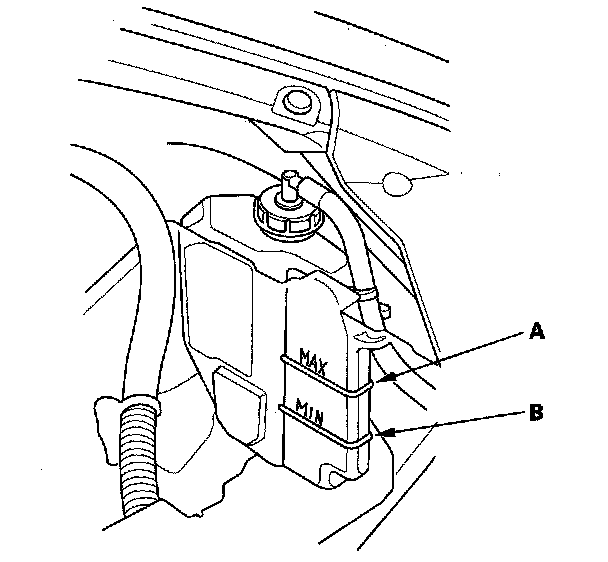 Coolant Check1. Look at the coolant level in the coolant reservoir. Make sure it is between the MAX mark (A) and MIN mark (B).