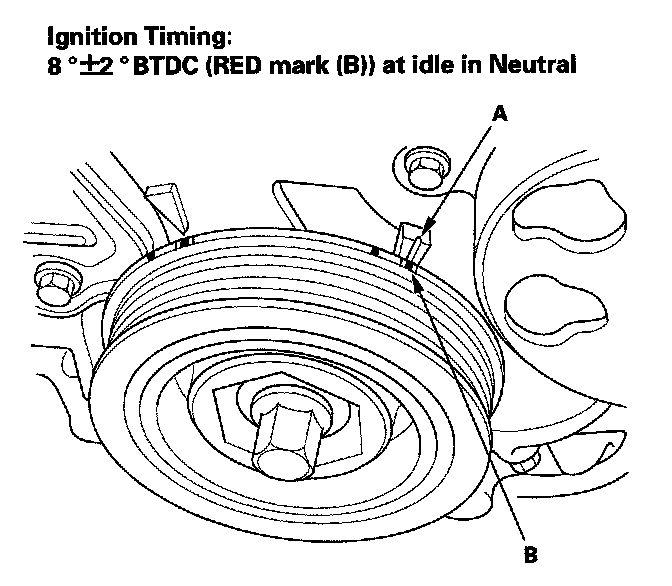 8. Aim the light toward the pointer (A) on the cam chain case. Check the ignition timing under a no load condition (headlights, blower fan, rear window defogger, and air conditioner are turned off).