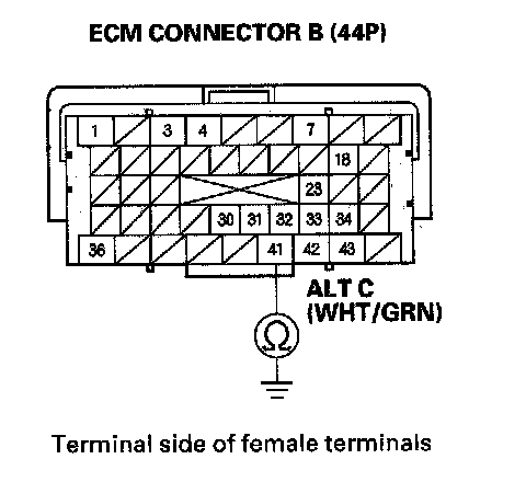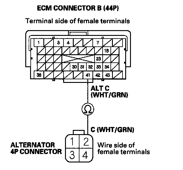 13. Check for continuity between ECM connector terminal B41 and alternator 4P connector terminal No.2.