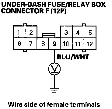 15. Using the backprobe set, measure the voltage between the No. 9 terminal of under-dash fuse/relay box connector F (12P) and body ground with the under-dash fuse/relay box connectors connected.