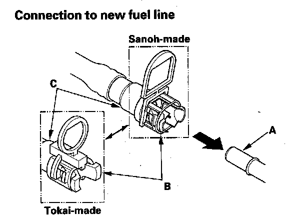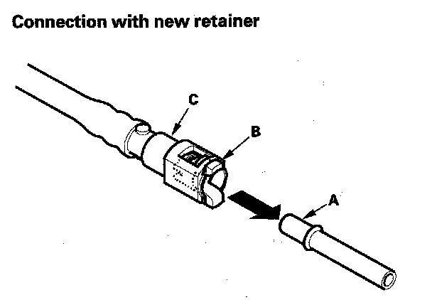 5. When you are reconnecting the connector with the old retainer, make sure the connection is secure and the tabs (A) are firmly locked into place; check visually and also by pulling the connector (B). When you are replacing the fuel line with a new one, make sure you remove the ring pull (C) upwards after you confirm the connection is secure.