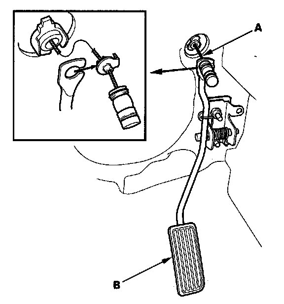 4. Remove the throttle cable (A) from the accelerator pedal (B).