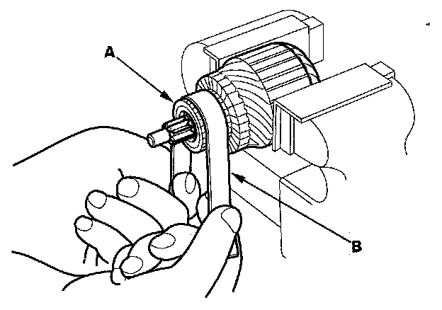 4. Check the commutator (A) surface. If the surface is dirty or burnt, resurface it with an emery cloth or a lathe to the following specifications in step 5, or recondition with #500 or #600 sandpaper (B).