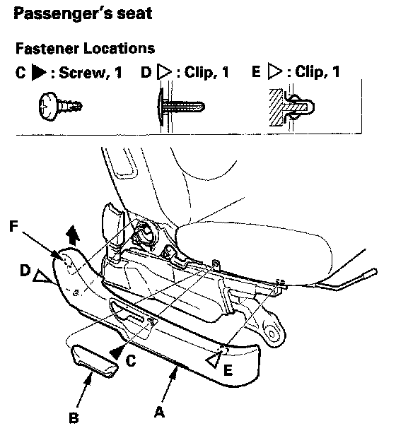 3. Remove the screw (C) on the passenger's seat, and release the rear clip (D) on each side seat.