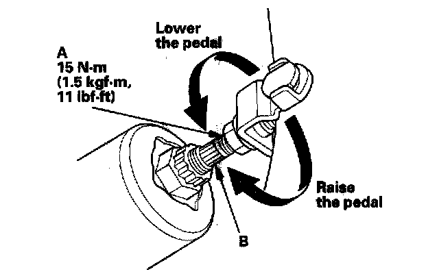 3. Loosen the pushrod locknut (A), and screw the pushrod (B) in or out with pliers until the standard pedal height from the floor is reached. After adjustment, tighten the locknut firmly. Do not adjust the pedal height with the pushrod pressed.