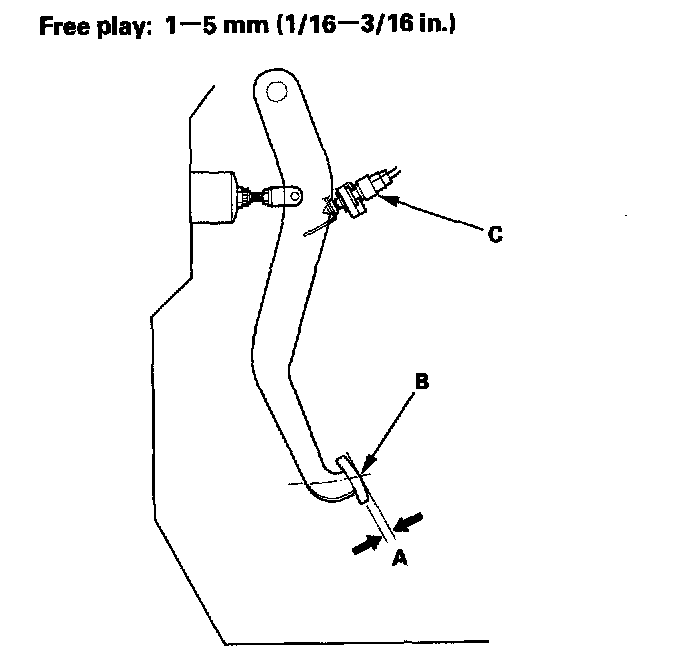 2. If the pedal free play is out of specification, adjust the brake pedal position switch (C). If the pedal free play is insufficient, it may result in brake drag.