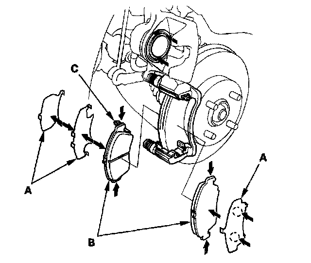 15. Install the brake pads and pad shims correctly. Install the brake pad with the wear indicator (C) on the upper inside. If you are reusing the brake pads, always reinstall the brake pads in their original positions to prevent a momentary loss of braking efficiency.