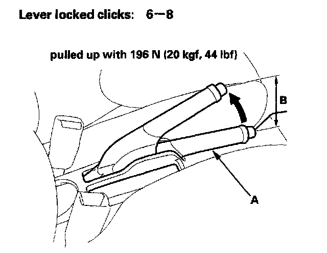 1. Pull the parking brake lever (A) with 196 N (20 kgf, 44 lbf) of force to fully apply the parking brake. The parking brake lever should be locked within the specified number of clicks (B).