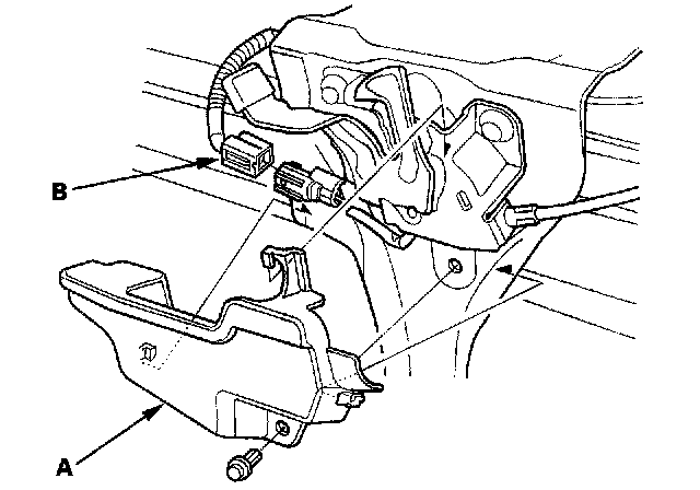 8. Remove the hood latch cover (A) and connector (B).