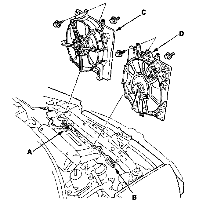 With A/C: Remove the radiator fan shroud (C), then remove the A/C condenser fan shroud (D).