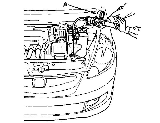 2. Attach commercially available pressure tester (A) to the radiator, and apply a pressure of 93-123 kPa (0.95-1.25 kgf/cm2, 14-18 psi).