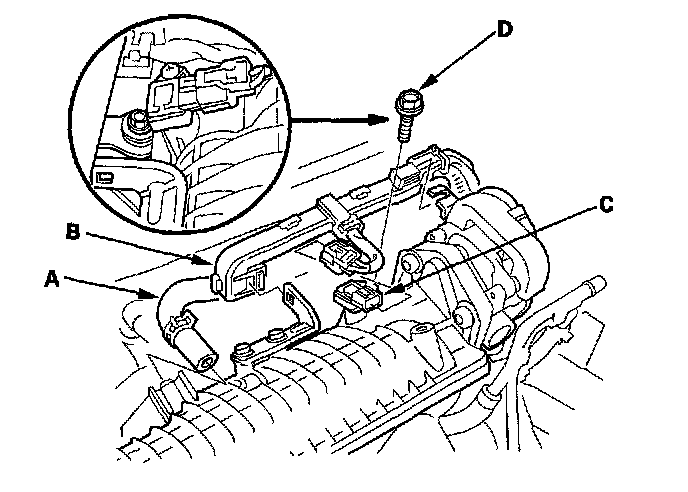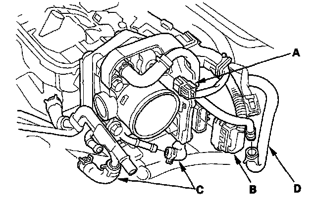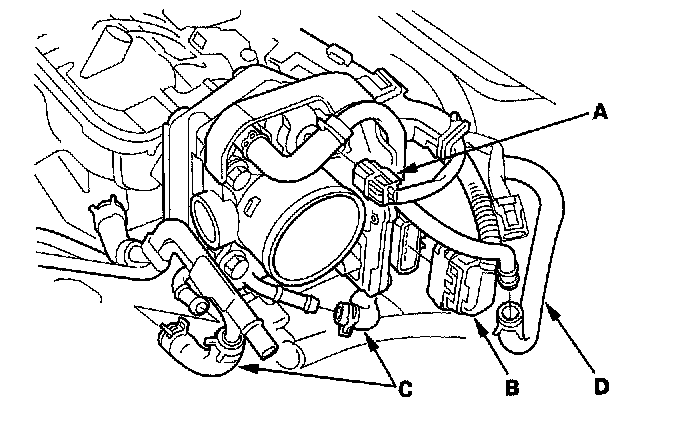 5. Remove the evaporative emission (EVAP) canister purge valve connector (A), throttle body connector (B), water bypass hoses (C) and purge hose (D).