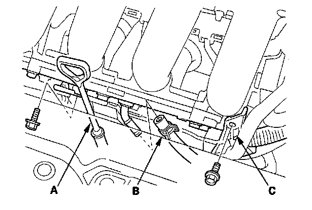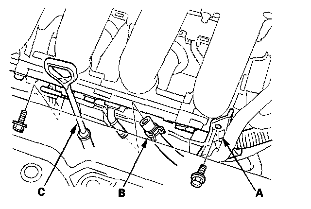 7. Remove the harness holder (A), PCV hose (B), and dipstick (C).