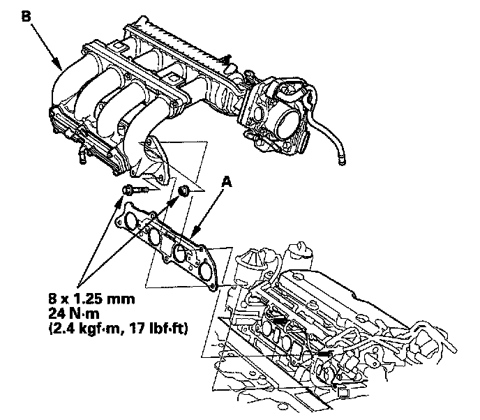 2. Install the intake manifold (B) and tighten the bolts/nuts in a crisscross pattern in two or three steps, beginning with the inner bolt.