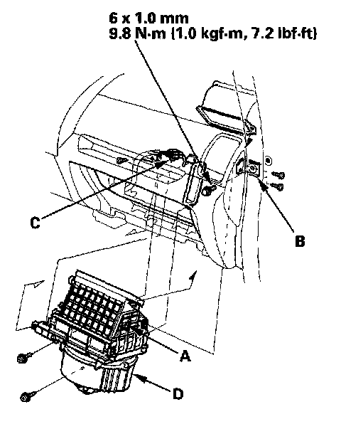 4. Remove the clip (A). Remove the mounting bolt, the screws, and the bracket (B). Remove the connector clip (C). Remove the self-tapping screws and the blower unit (D).