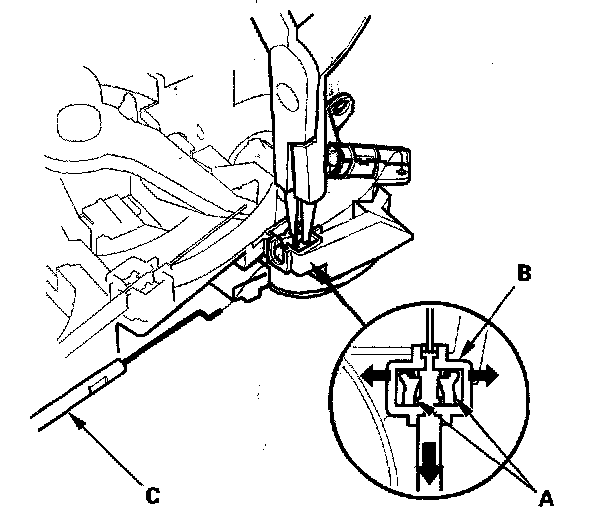 3. Expand the cable stops (A) in the cable holder (B) using snap ring pliers, then pull out the control cable (C).