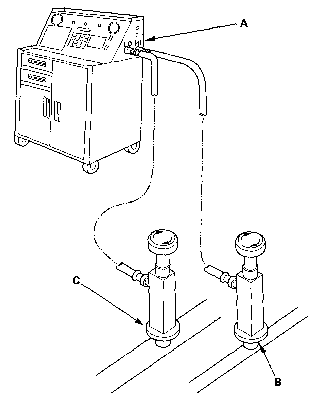 1. Connect an R-134a refrigerant recovery/recycling/charging station (A) to the high-pressure service port (B) and the low-pressure service port (C) as shown, following the equipment manufacturer's instructions.