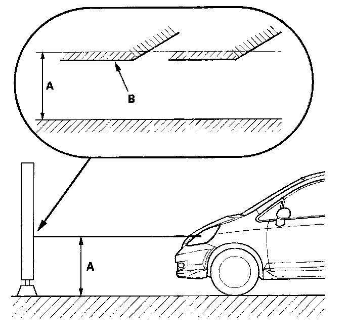 Measure the height of the headlights (A) The lights should reflect 2.1 in. (52 mm) below headlight height (B).