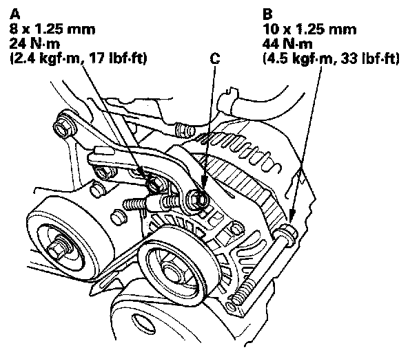 3. Turn the adjusting bolt (C) to obtain the proper belt tension, then retighten the lock bolt and the mounting bolt.