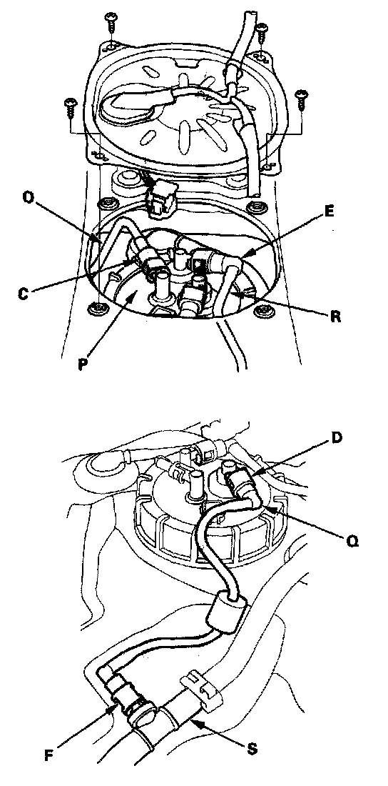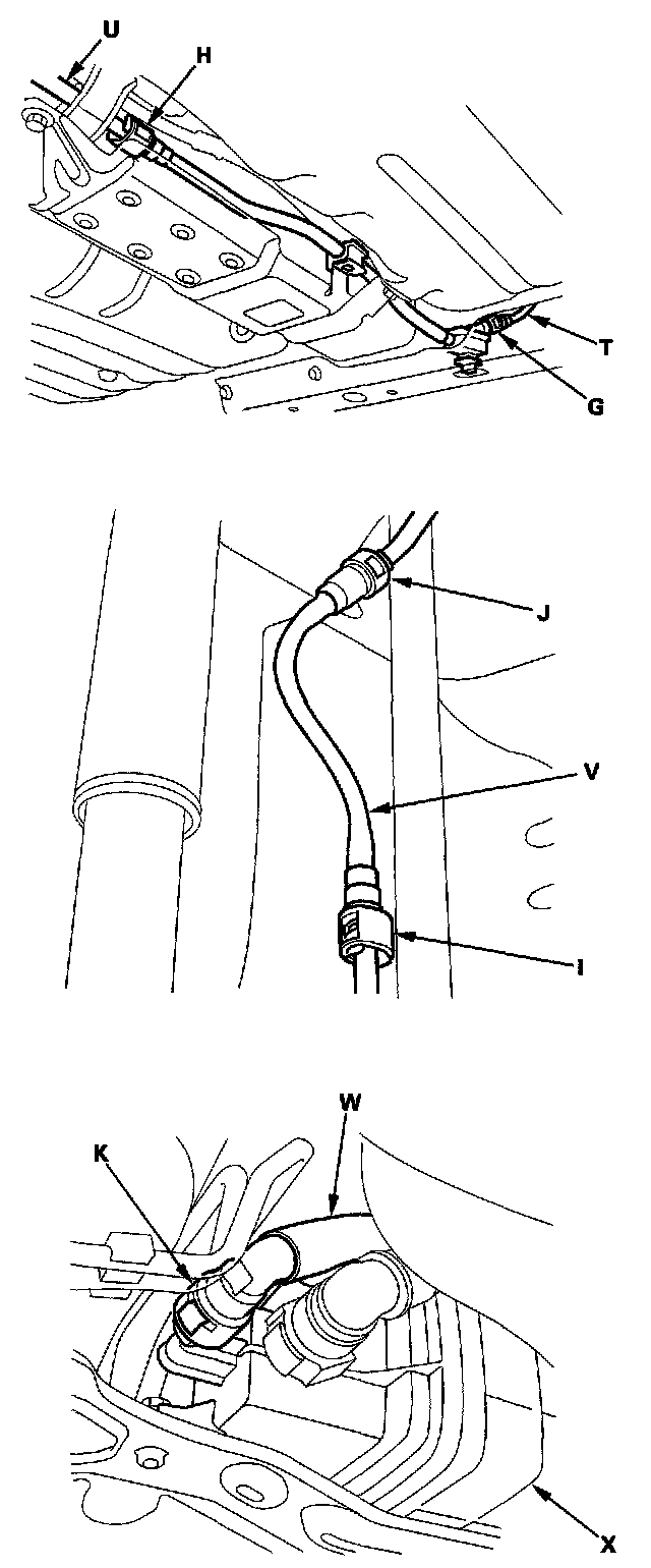 Fuel Line/Quick-Connect Fitting PrecautionsThe fuel line/quick-connect fittings (A), (B), (C), (D), (E), (F), (G), (H), (1), (J), (K) connect the fuel rail (L) to fuel feed tube (M), the fuel feed tube to the fuel line (N), the fuel line (0) to the fuel tank unit (P), the fuel tank unit to the fuel vent tube (Q), the fuel tank unit to the suction line (R), the fuel vent tube to the vent shut float tube (S), the suction tube to the return tube (T), the suction tube to the breather pipe (U), the breather pipe to the breather tube (V), the fuel vapor line (W) to the EVAP canister (X). When removing or installing the fuel feed tube, fuel tank unit or fuel tank, it is necessary to disconnect or connect the quick-connect fittings. Pay attention to the following: