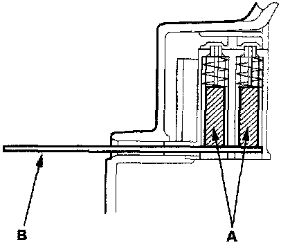 20. Push the brushes (A) in, then insert a pin or drill bit (B) (about 1.8 mm (0.77 in.) diameter) to hold them in place.