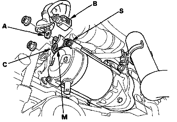 3. Remove the starter cable terminal (A), BLK/WHT wire connector (B), and motor cable (C).