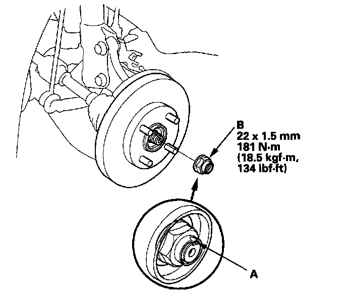 ^ Before installing the spindle nut, apply a small amount of engine oil to the seating surface of the nut. After tightening, use a drift to stake the spindle nut shoulder against the driveshaft.