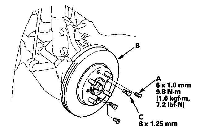 NOTE: If the brake disc has clung to the hub. Screw two 8 x 1.25 mm bolts (C) into the brake disc to push it away from the hub. Turn each bolt 90° at a time to prevent the brake disc from binding.