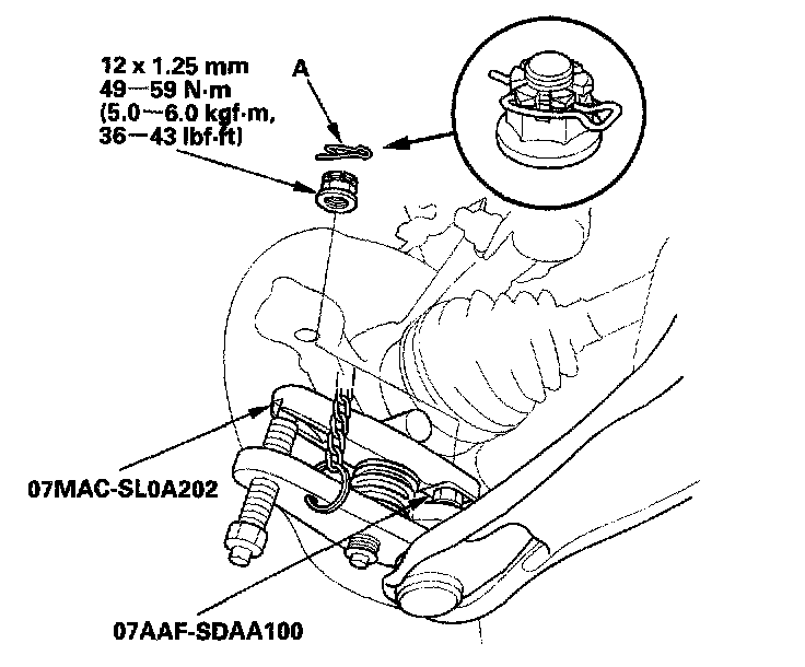 12. Remove the lock pin (A) from the lower arm ball joint, then remove the nut.