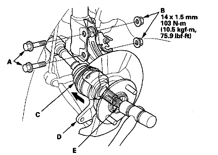 15. Remove the driveshaft outboard joint (C) from the knuckle (D) by tapping the driveshaft end (E) with a plastic hammer while drawing the hub outward, then remove the knuckle.