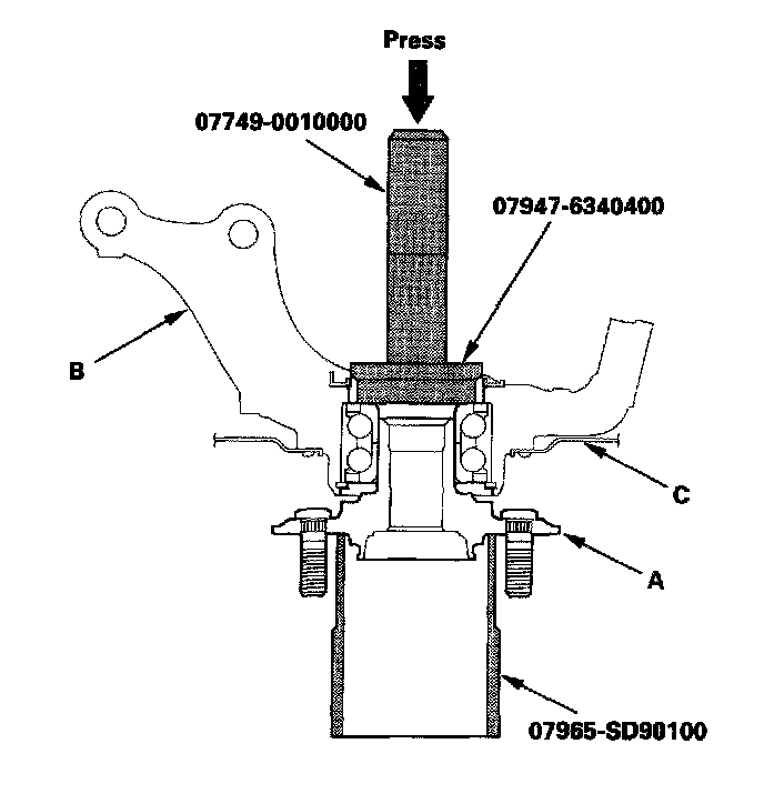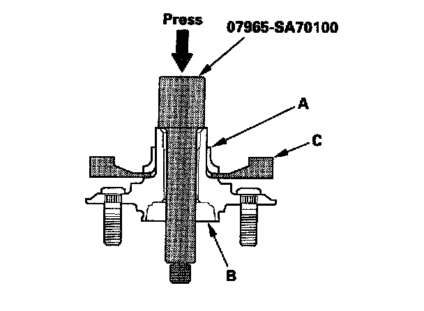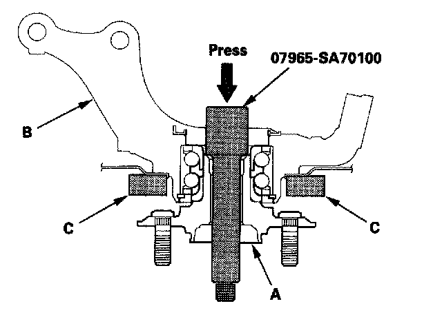1. Separate the hub (A) from the knuckle (B) using the special tool and a hydraulic press. Hold the knuckle with the attachment (C) of the hydraulic press or equivalent tool. Be careful not to deform the splash guard. Hold onto the hub to keep it from falling when pressed clear.