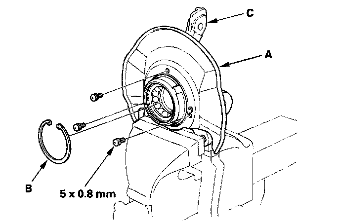 3. Remove the splash guard (A) and the snap ring (B) from the knuckle (C).