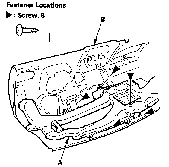 7. Remove the screws securing the dashboard duct (A) on the dashboard (B).