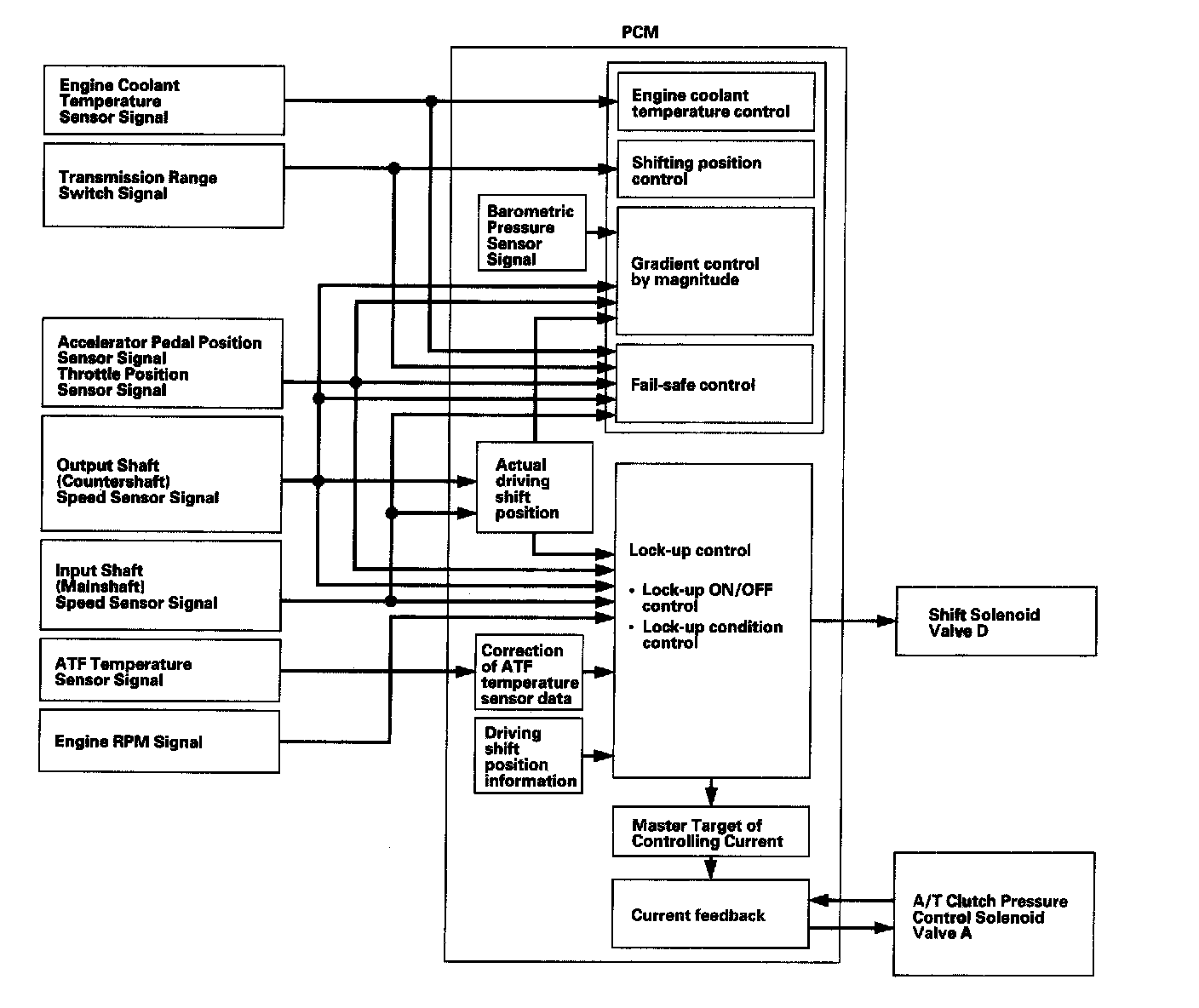 Shift solenoid valve D controls the hydraulic pressure to switch the lock-up shift valve and lock-up ON and OFF. The PCM actuates shift solenoid valve D and A/T clutch pressure control solenoid valve A to start lock-up. A/T clutch pressure control solenoid valve A applies and regulates hydraulic pressure to the lock-up control valve to control the amount of lock-up.