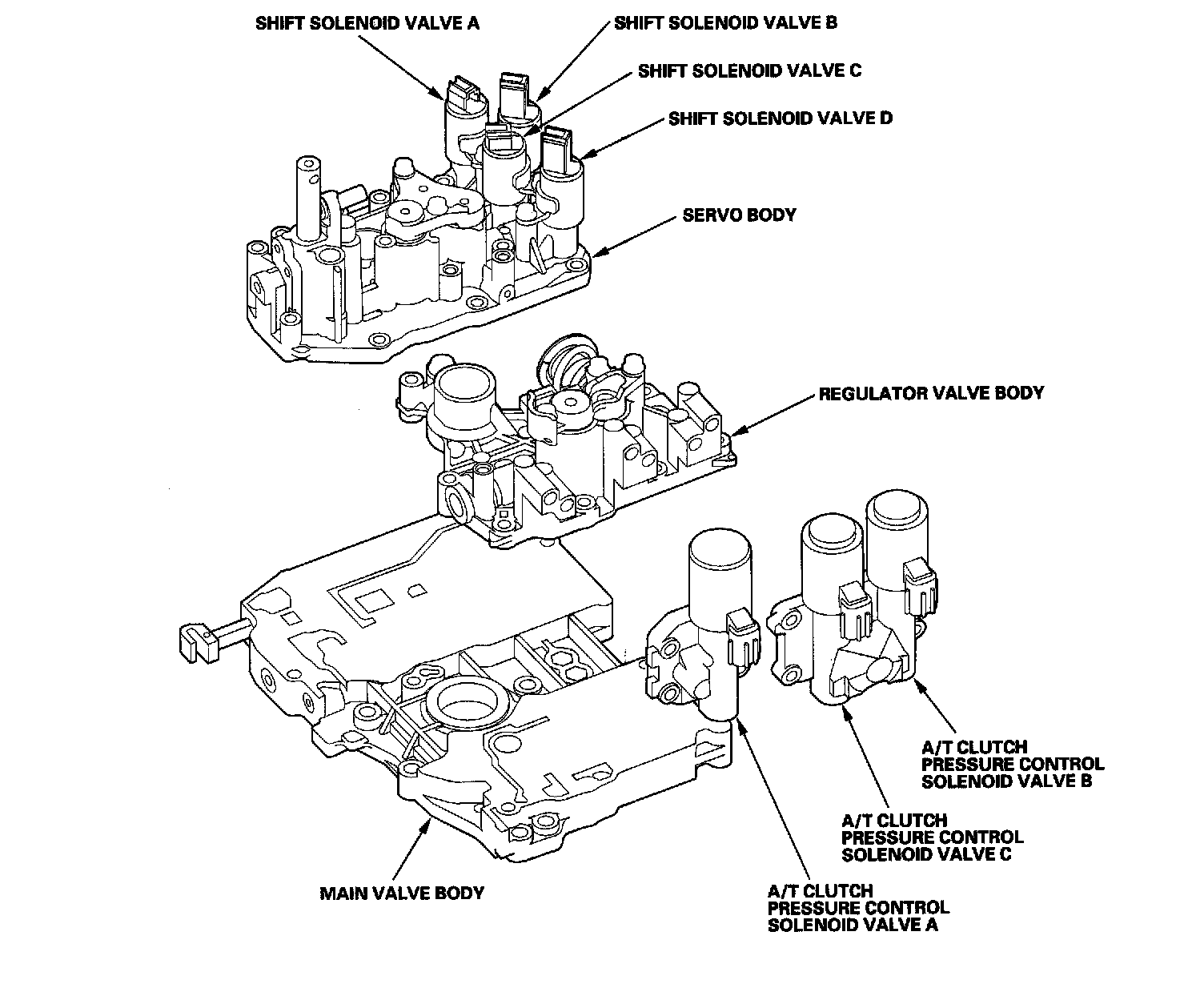 The valve body includes the main valve body, the regulator valve body, and the servo body. The ATF pump is driven by splines on the end of the torque converter which is attached to the engine. Fluid flows through the regulator valve to maintain specified pressure through the main valve body to the manual valve, directing pressure to each of the clutches. Shift solenoid valves A, B, C, and D are mounted on the servo body. A/T clutch pressure control solenoid valves A, B, and C are mounted on the transmission housing.