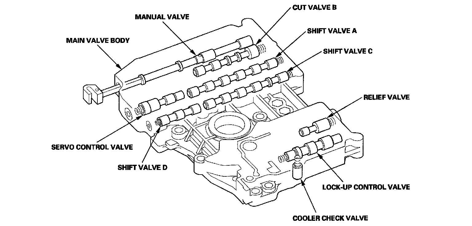 The main valve body contains the manual valve, cut valve B, shift valves A, C, and D, the relief valve, the lock-up control valve, the cooler check valve, the servo control valve, and the ATF pump gears. The primary function of the main valve body is to switch fluid pressure on and off to control hydraulic pressure going to the hydraulic control system.