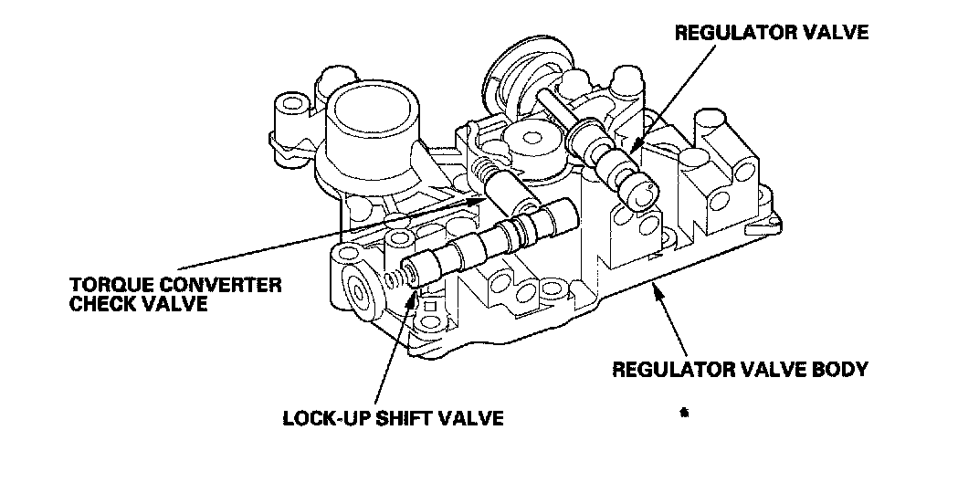 The regulator valve body is located on the main valve body. The regulator valve body contains the regulator valve, the torque converter check valve, the lock-up shift valve, the 1st accumulator, and the 3rd accumulator.