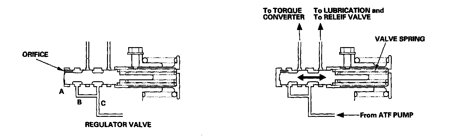 The regulator valve maintains constant hydraulic pressure from the ATF pump to the hydraulic control system. While also furnishing fluid to the lubrication system and torque converter. Fluid from the ATF pump flows through B and C. Fluid entering from B flows through the valve orifice to the A cavity. This pressure of the A cavity pushes the regulator valve to the spring side, and this movement of the regulator valve uncovers the fluid port to the torque converter and the relief valve. The fluid flows out to the torque converter and the relief valve, and the regulator valve returns under spring force. According to the level of the hydraulic pressure through B, the position of the regulator valve changes, and the amount of fluid from C through the torque converter changes. This operation is continued, maintaining the line pressure.