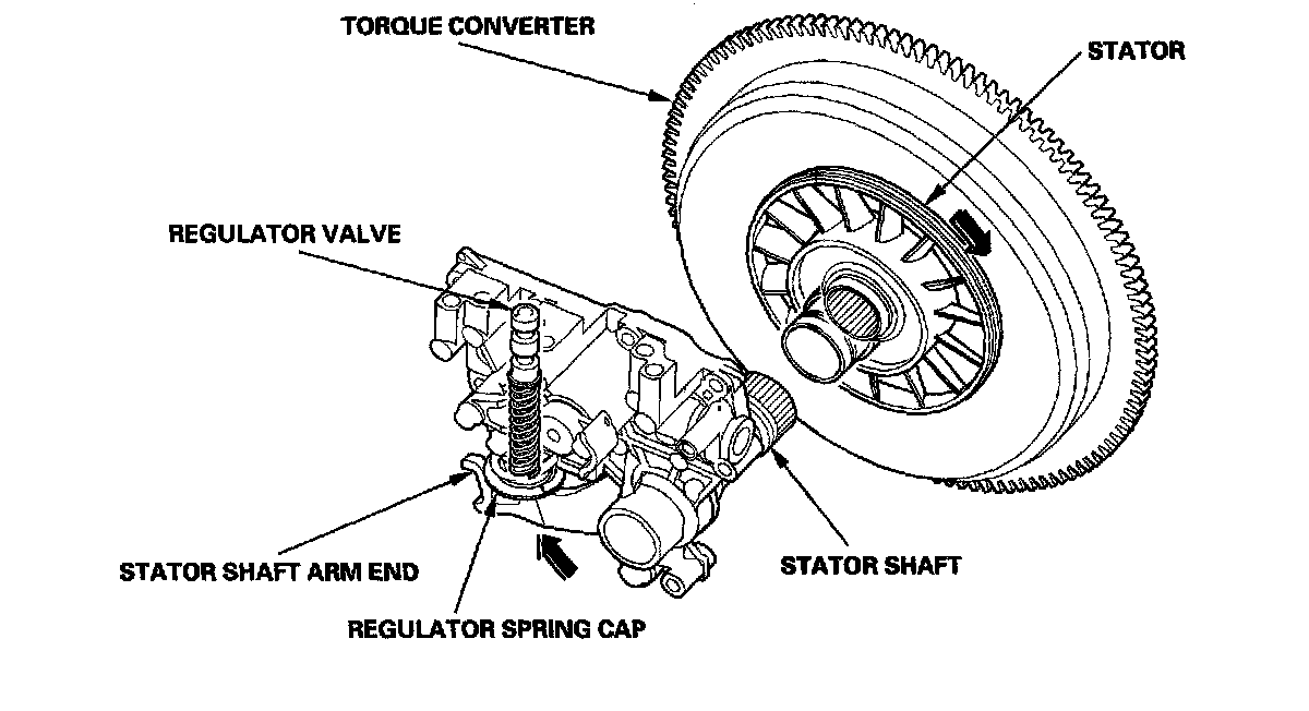 Increases in hydraulic pressure according to torque are performed by the regulator valve using stator torque reaction. The stator shaft is splined to the stator in the torque converter, and its arm end contacts the regulator spring cap. When the vehicle is accelerating or climbing (torque converter range), stator torque reaction acts on the stator shaft, and the stator arm pushes the regulator spring cap in the direction of the arrow in proportion to the reaction. The stator reaction spring compresses, and the regulator valve moves to increase the line pressure which is regulated by the regulator valve. The line pressure reaches its maximum when the stator torque reaction reaches its maximum.