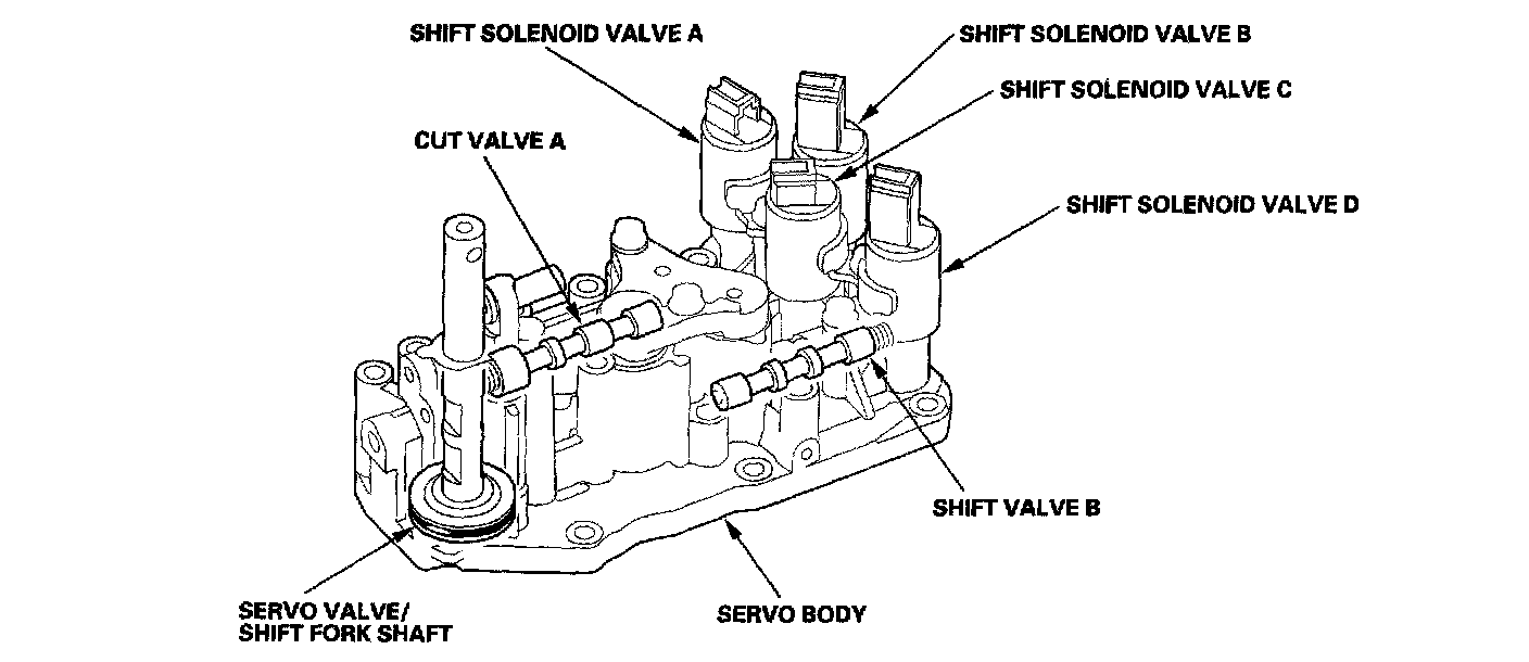 The servo body is on the main valve body. The servo body contains the servo valve, shift valve B, cut valve A, accumulators for 2nd, 4th, and 5th, and shift solenoid valves A, B, C, and D.