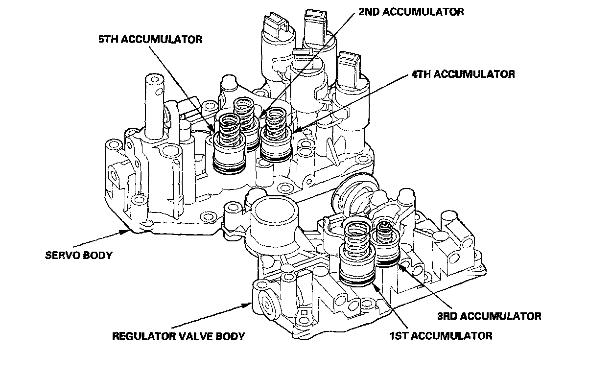 The accumulators are located in the regulator valve body and servo body. The regulator valve body contains the 1st and 3rd accumulators, and the servo body contains the 2nd, 4th, and 5th accumulators.