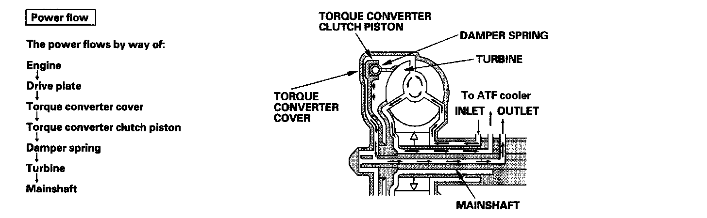 Fluid in the chamber between the torque converter cover and the torque converter clutch piston is drained off, and fluid entering from the chamber between the pump and stator exerts pressure through the torque converter clutch piston against the torque converter cover. The torque converter clutch piston engages with the torque converter cover; the torque converter clutch lock-up is ON, and the mainshaft rotates at the same speed as the engine.