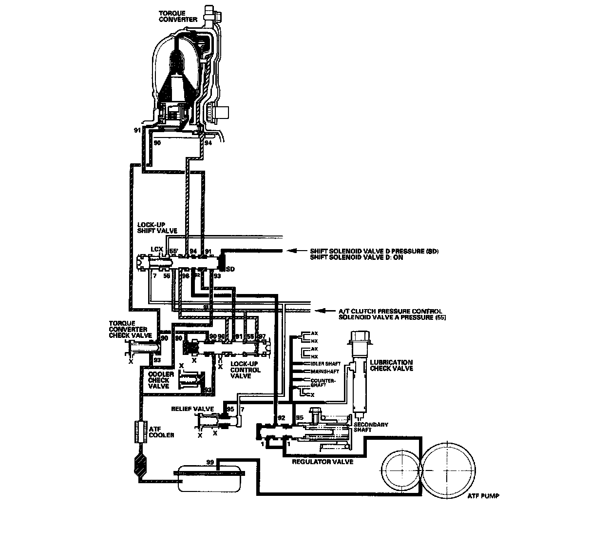 When the vehicle speed further increases, the PCM controls A/T clutch pressure control solenoid valve A to increase A/T clutch pressure control solenoid valve A pressure (55). A/T clutch pressure control solenoid valve A pressure (55) is applied to the lock-up control valve, and the lock-up control valve is moved to the left side to release torque converter back pressure (94). Torque converter pressure (91) enters into the front of the torque converter, and the torque converter clutch piston is securely engaged with the torque converter cover by torque converter pressure. Under this condition, torque converter back pressure is released fully, causing the torque converter clutch to be fully engaged; this condition is full lock-up.