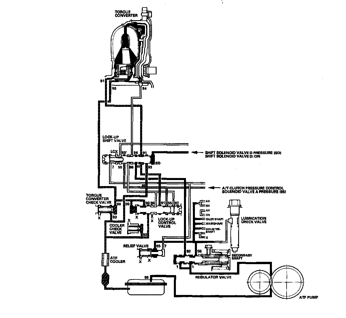 As the speed of the vehicle reaches the programmed value, the PCM turns shift solenoid valve DON. Shift solenoid valve D pressure (SD) is applied to the right end of the lock-up shift valve to switch the torque converter pressure port leading to the front of the torque converter. Torque converter pressure (91) enters into the front of the torque converter to engage the torque converter clutch piston. The PCM also controls A/T clutch pressure control solenoid valve A to regulate A/T clutch pressure control solenoid valve A pressure (55), and A/T clutch pressure control solenoid valve A pressure (55) is applied to the lock-up control valve. Torque converter pressure (94) drained from the back of the torque converter is applied to the right side of the lock-up control valve, and torque converter pressure (90) is applied to the left side of the lock-up control valve. The lock-up control valve controls the amount of the lock-up by receiving these pressures. The torque converter clutch is engaged partially when torque converter pressure (90) in the left side of the lock-up control valve is higher, and the torque converter clutch is engaged securely according to the amount of pressure in the right side of the lock-up control valve. Under this condition, the torque converter clutch is engaged by pressure entering into the front side of the torque converter; this condition is partial lock-up.