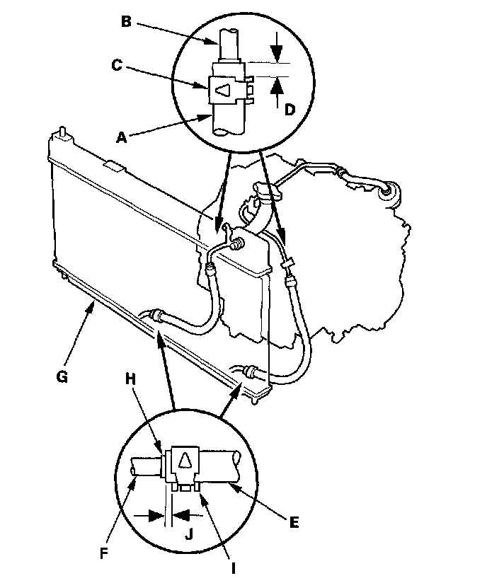 3. Install the ATF cooler hoses (E) over the lines (F) on the ATF cooler (G); insert the hoses to the bulge (H) of the lines.