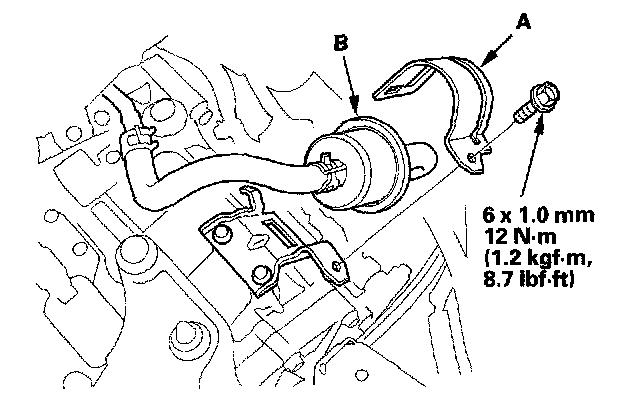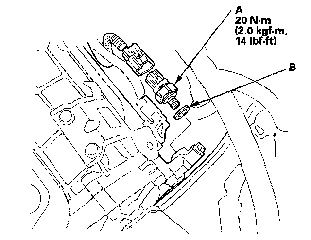 8. Install the new 2nd clutch transmission fluid pressure switch with a new sealing washer (B), and tighten the metal part of the switch.