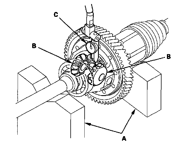 2. Measure the backlash of the pinion gears (B) with a dial indicator (C).